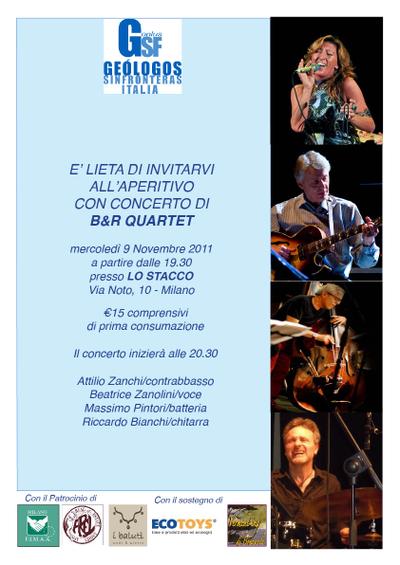 Vi aspettiamo il 9 novembre dalle 19,30 per un APERITIVO CON CONCERTO € 15 comprensivi di prima consumazione Il concerto avrà inizio alle 20.30 B&R Quartet Beatrice Zanolini : Voce Riccardo Bianchi : Chitarra Attilio Zanchi : Contrabbasso Massimo Pintori : Batteria durante la serata ci sarà la possibilità di acquistare le bellissime collane di “I Baluti” (http://www.ibaluti.it/index.php) oppure alcuni giocattoli e accessori di “Ecotoys” ( http://www.ecotoys.it/)o ancora delle ottime bottiglie di vino “Vermenting” (http://www.vermenting.com/)... per cominciare a pensare ai vostri regali di Natale... Parte degli incassi sarà devoluta al nostro Progetto “Acqua per Haiti” NON POTETE MANCARE!!!!!!