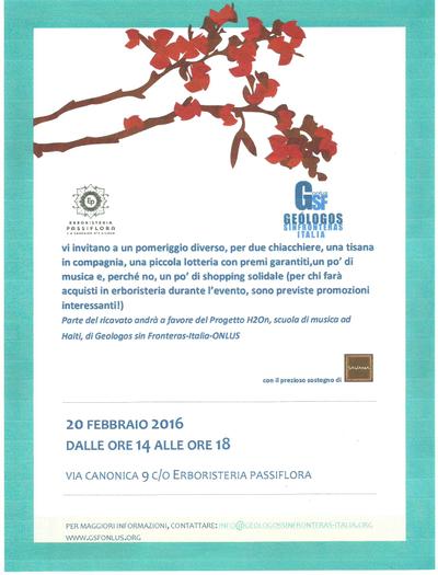 vi invitiamo, con Erboristeria Passiflora, a un pomeriggio diverso, per due chiacchiere, una tisana in compagnia,un po’ di musica e, perché no, un po’ di shopping solidale (per chi farà acquisti in erboristeria durante l’evento, sono previste promozioni interessanti!), una piccola lotteria con premi garantiti, e un primo premio favoloso: una cena per due presso il ristorante Savana Ristorante Eritreo, in Via Canonica. Parte del ricavato andrà a favore del Progetto H2On, scuola di musica ad Haiti, di Geologos sin Fronteras-Italia-ONLUS