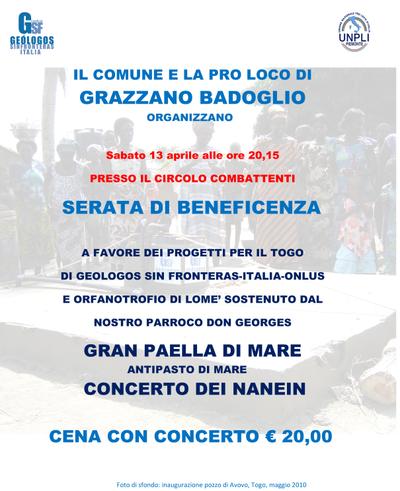 Sabato 13 aprile, a Grazzano Badoglio (Asti) si terrà una magnifica serata organizzata dal Comune e dalla Pro Loco di Grazzano Badoglio, a favore di GsF e dei nostri futuri progetti in Togo. dalle ore 20.15, con una cena a base di Paella e a seguire il concerto dei Nanein. Cena e concerto a 20 € Vi aspettiamo!